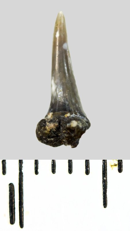Зуб (фрагмент). Акула. Lamniformes gen. et sp. indet. Классификация: Хордовые Chordata, Позвоночные Vertebrata, Хрящевые рыбы Chondrichthyes, Пластиножаберные Elasmobranchii, Акулы Selachii, Ламнообразные Lamniformes
