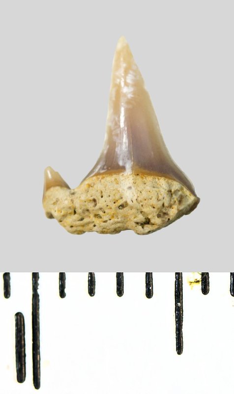 Зуб (фрагмент). Акула. Lamniformes gen. et sp. indet. Классификация: Хордовые Chordata, Позвоночные Vertebrata, Хрящевые рыбы Chondrichthyes, Пластиножаберные Elasmobranchii, Акулы Selachii, Ламнообразные Lamniformes