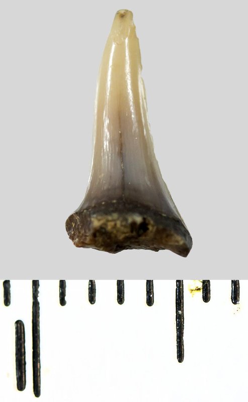 Зуб (фрагмент). Акула. Lamniformes gen. et sp. indet. Классификация: Хордовые Chordata, Позвоночные Vertebrata, Хрящевые рыбы Chondrichthyes, Пластиножаберные Elasmobranchii, Акулы Selachii, Ламнообразные Lamniformes