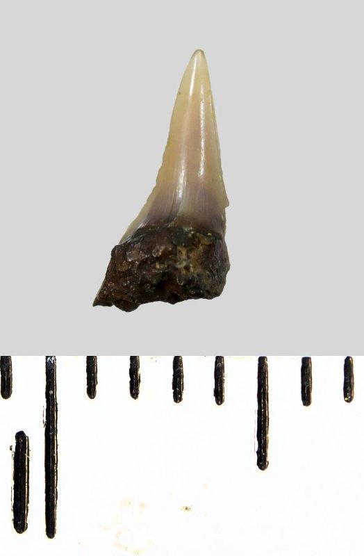 Зуб (фрагмент). Акула. Lamniformes gen. et sp. indet. Классификация: Хордовые Chordata, Позвоночные Vertebrata, Хрящевые рыбы Chondrichthyes, Пластиножаберные Elasmobranchii, Акулы Selachii, Ламнообразные Lamniformes