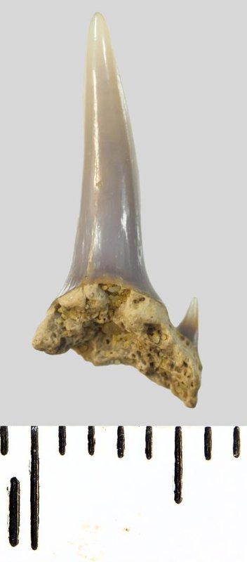 Зуб (фрагмент). Акула. Lamniformes gen. et sp. indet. Классификация: Хордовые Chordata, Позвоночные Vertebrata, Хрящевые рыбы Chondrichthyes, Пластиножаберные Elasmobranchii, Акулы Selachii, Ламнообразные Lamniformes