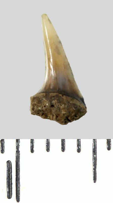 Зуб (фрагмент). Акула. Lamniformes gen. et sp. indet. Классификация: Хордовые Chordata, Позвоночные Vertebrata, Хрящевые рыбы Chondrichthyes, Пластиножаберные Elasmobranchii, Акулы Selachii, Ламнообразные Lamniformes