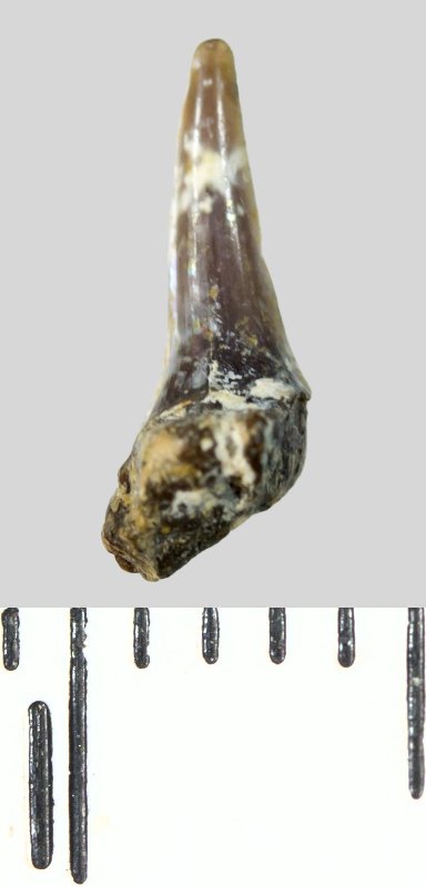 Зуб (фрагмент). Акула. Lamniformes gen. et sp. indet. Классификация: Хордовые Chordata, Позвоночные Vertebrata, Хрящевые рыбы Chondrichthyes, Пластиножаберные Elasmobranchii, Акулы Selachii, Ламнообразные Lamniformes