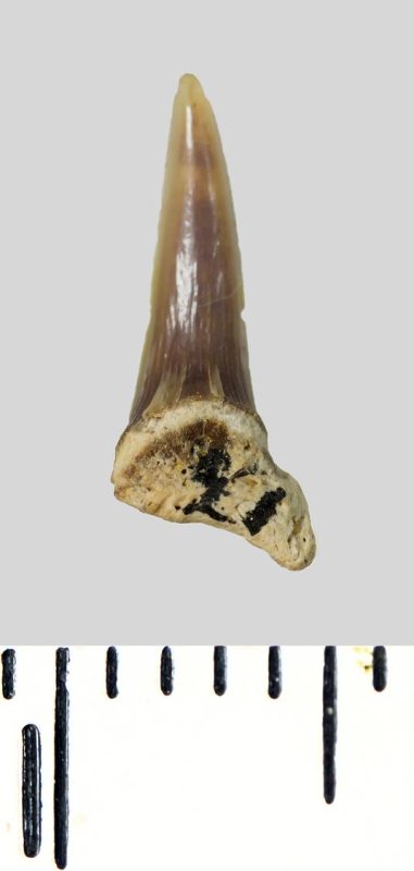 Зуб (фрагмент). Акула. Lamniformes gen. et sp. indet. Классификация: Хордовые Chordata, Позвоночные Vertebrata, Хрящевые рыбы Chondrichthyes, Пластиножаберные Elasmobranchii, Акулы Selachii, Ламнообразные Lamniformes