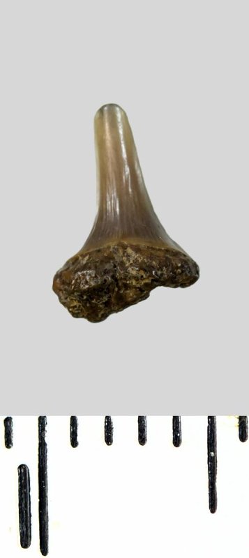 Зуб (фрагмент). Акула. Lamniformes gen. et sp. indet. Классификация: Хордовые Chordata, Позвоночные Vertebrata, Хрящевые рыбы Chondrichthyes, Пластиножаберные Elasmobranchii, Акулы Selachii, Ламнообразные Lamniformes