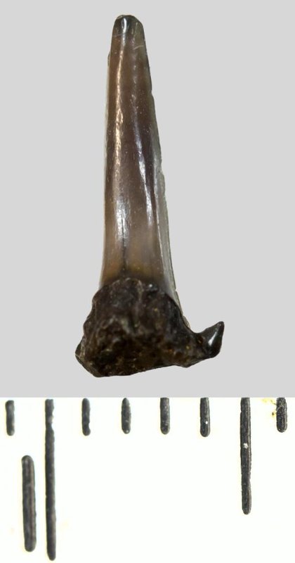 Зуб (фрагмент). Акула. Lamniformes gen. et sp. indet. Классификация: Хордовые Chordata, Позвоночные Vertebrata, Хрящевые рыбы Chondrichthyes, Пластиножаберные Elasmobranchii, Акулы Selachii, Ламнообразные Lamniformes
