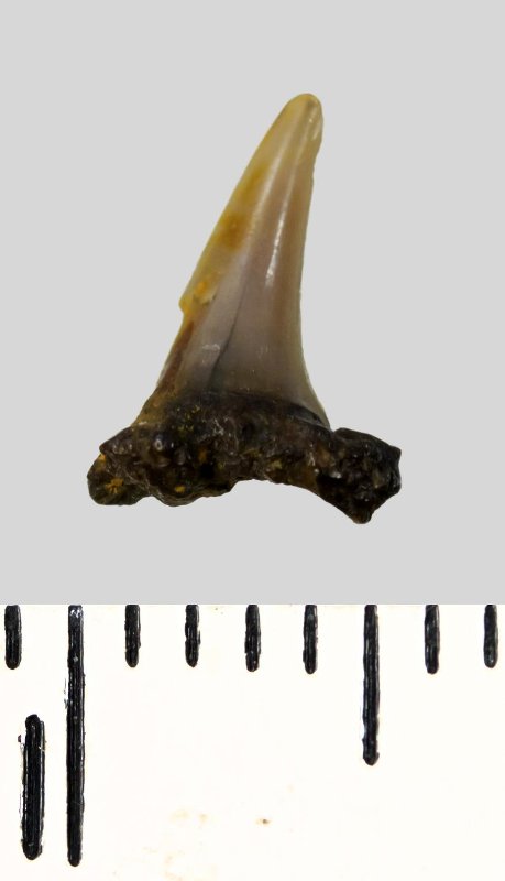 Зуб (фрагмент). Акула. Lamniformes gen. et sp. indet. Классификация: Хордовые Chordata, Позвоночные Vertebrata, Хрящевые рыбы Chondrichthyes, Пластиножаберные Elasmobranchii, Акулы Selachii, Ламнообразные Lamniformes
