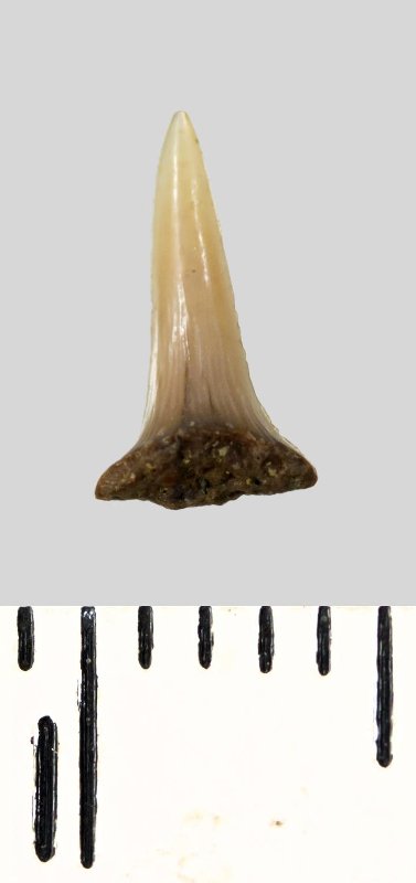 Зуб (фрагмент). Акула. Lamniformes gen. et sp. indet. Классификация: Хордовые Chordata, Позвоночные Vertebrata, Хрящевые рыбы Chondrichthyes, Пластиножаберные Elasmobranchii, Акулы Selachii, Ламнообразные Lamniformes