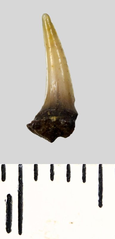 Зуб (фрагмент). Акула. Lamniformes gen. et sp. indet. Классификация: Хордовые Chordata, Позвоночные Vertebrata, Хрящевые рыбы Chondrichthyes, Пластиножаберные Elasmobranchii, Акулы Selachii, Ламнообразные Lamniformes