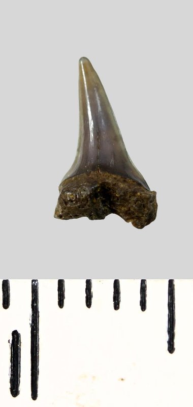 Зуб (фрагмент). Акула. Lamniformes gen. et sp. indet. Классификация: Хордовые Chordata, Позвоночные Vertebrata, Хрящевые рыбы Chondrichthyes, Пластиножаберные Elasmobranchii, Акулы Selachii, Ламнообразные Lamniformes
