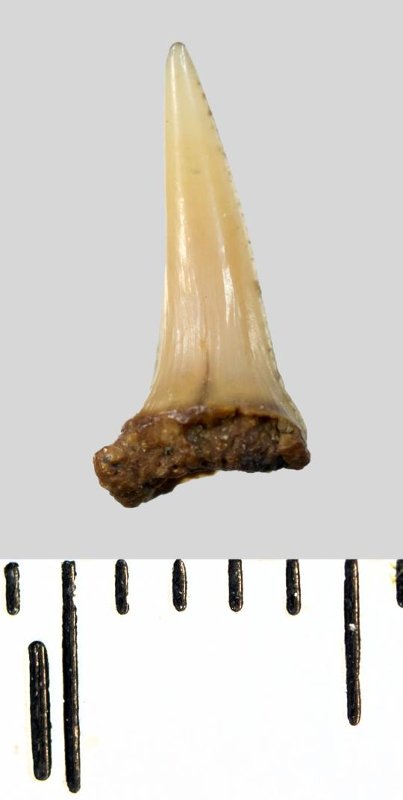 Зуб (фрагмент). Акула. Lamniformes gen. et sp. indet. Классификация: Хордовые Chordata, Позвоночные Vertebrata, Хрящевые рыбы Chondrichthyes, Пластиножаберные Elasmobranchii, Акулы Selachii, Ламнообразные Lamniformes