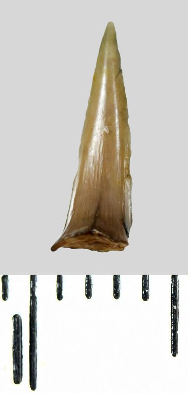 Зуб (фрагмент). Акула. Lamniformes gen. et sp. indet. Классификация: Хордовые Chordata, Позвоночные Vertebrata, Хрящевые рыбы Chondrichthyes, Пластиножаберные Elasmobranchii, Акулы Selachii, Ламнообразные Lamniformes