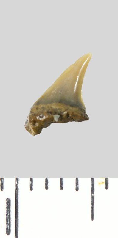 Зуб (фрагмент). Акула. Lamniformes gen. et sp. indet. Классификация: Хордовые Chordata, Позвоночные Vertebrata, Хрящевые рыбы Chondrichthyes, Пластиножаберные Elasmobranchii, Акулы Selachii, Ламнообразные Lamniformes