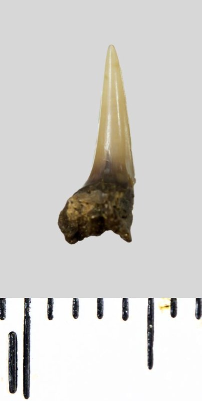 Зуб (фрагмент). Акула. Lamniformes gen. et sp. indet. Классификация: Хордовые Chordata, Позвоночные Vertebrata, Хрящевые рыбы Chondrichthyes, Пластиножаберные Elasmobranchii, Акулы Selachii, Ламнообразные Lamniformes