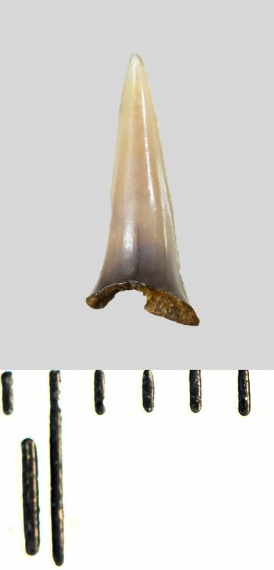 Зуб (фрагмент). Акула. Lamniformes gen. et sp. indet. Классификация: Хордовые Chordata, Позвоночные Vertebrata, Хрящевые рыбы Chondrichthyes, Пластиножаберные Elasmobranchii, Акулы Selachii, Ламнообразные Lamniformes