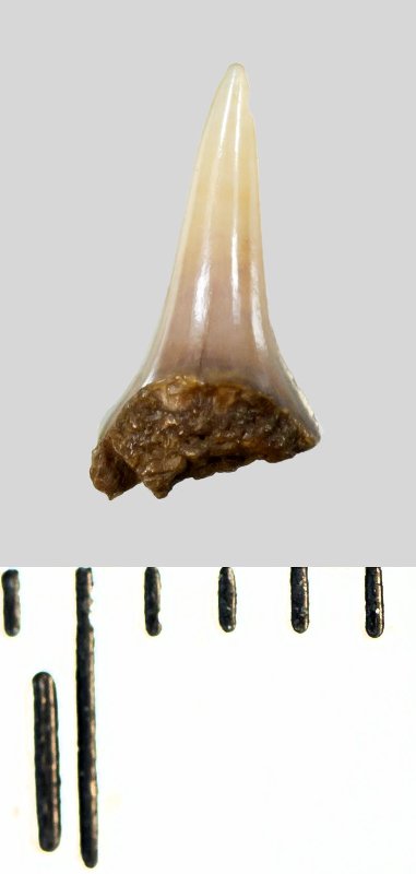 Зуб (фрагмент). Акула. Lamniformes gen. et sp. indet. Классификация: Хордовые Chordata, Позвоночные Vertebrata, Хрящевые рыбы Chondrichthyes, Пластиножаберные Elasmobranchii, Акулы Selachii, Ламнообразные Lamniformes