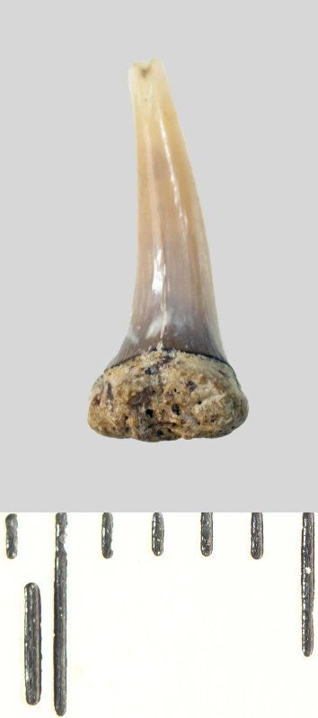 Зуб (фрагмент). Акула. Lamniformes gen. et sp. indet. Классификация: Хордовые Chordata, Позвоночные Vertebrata, Хрящевые рыбы Chondrichthyes, Пластиножаберные Elasmobranchii, Акулы Selachii, Ламнообразные Lamniformes