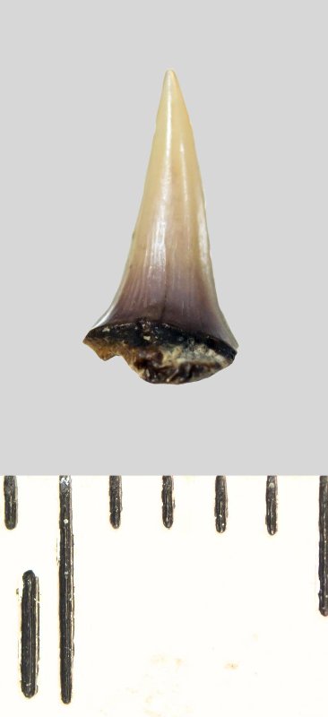 Зуб (фрагмент). Акула. Lamniformes gen. et sp. indet. Классификация: Хордовые Chordata, Позвоночные Vertebrata, Хрящевые рыбы Chondrichthyes, Пластиножаберные Elasmobranchii, Акулы Selachii, Ламнообразные Lamniformes