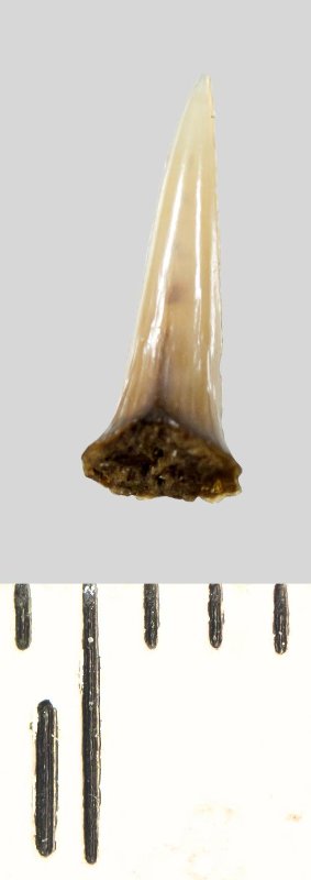 Зуб (фрагмент). Акула. Lamniformes gen. et sp. indet. Классификация: Хордовые Chordata, Позвоночные Vertebrata, Хрящевые рыбы Chondrichthyes, Пластиножаберные Elasmobranchii, Акулы Selachii, Ламнообразные Lamniformes