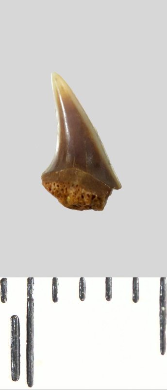 Зуб (фрагмент). Акула. Lamniformes gen. et sp. indet. Классификация: Хордовые Chordata, Позвоночные Vertebrata, Хрящевые рыбы Chondrichthyes, Пластиножаберные Elasmobranchii, Акулы Selachii, Ламнообразные Lamniformes