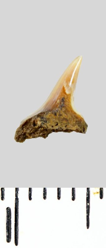 Зуб (фрагмент). Акула. Lamniformes gen. et sp. indet. Классификация: Хордовые Chordata, Позвоночные Vertebrata, Хрящевые рыбы Chondrichthyes, Пластиножаберные Elasmobranchii, Акулы Selachii, Ламнообразные Lamniformes