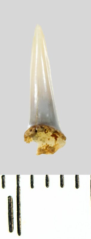 Зуб (фрагмент). Акула. Lamniformes gen. et sp. indet. Классификация: Хордовые Chordata, Позвоночные Vertebrata, Хрящевые рыбы Chondrichthyes, Пластиножаберные Elasmobranchii, Акулы Selachii, Ламнообразные Lamniformes