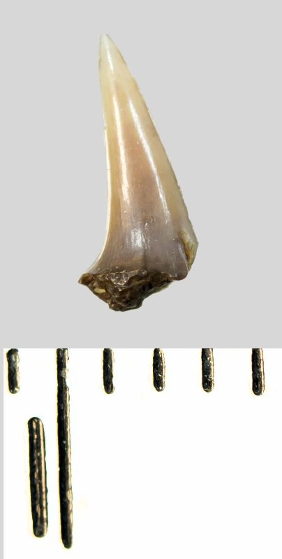 Зуб (фрагмент). Акула. Lamniformes gen. et sp. indet. Классификация: Хордовые Chordata, Позвоночные Vertebrata, Хрящевые рыбы Chondrichthyes, Пластиножаберные Elasmobranchii, Акулы Selachii, Ламнообразные Lamniformes