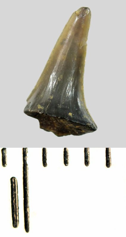 Зуб (фрагмент). Акула. Lamniformes gen. et sp. indet. Классификация: Хордовые Chordata, Позвоночные Vertebrata, Хрящевые рыбы Chondrichthyes, Пластиножаберные Elasmobranchii, Акулы Selachii, Ламнообразные Lamniformes