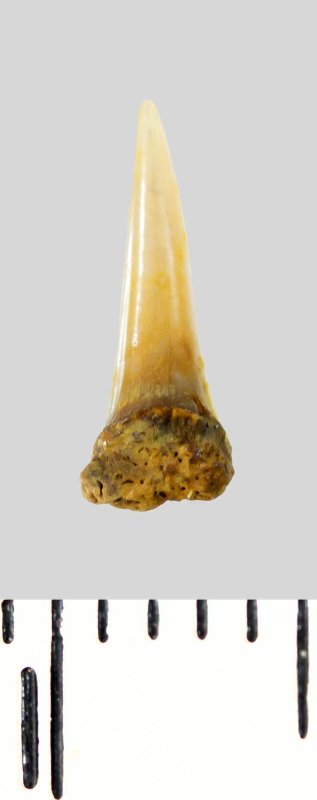 Зуб (фрагмент). Акула. Lamniformes gen. et sp. indet. Классификация: Хордовые Chordata, Позвоночные Vertebrata, Хрящевые рыбы Chondrichthyes, Пластиножаберные Elasmobranchii, Акулы Selachii, Ламнообразные Lamniformes