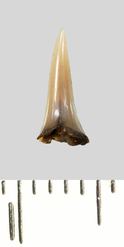 Зуб (фрагмент). Акула. Lamniformes gen. et sp. indet. Классификация: Хордовые Chordata, Позвоночные Vertebrata, Хрящевые рыбы Chondrichthyes, Пластиножаберные Elasmobranchii, Акулы Selachii, Ламнообразные Lamniformes