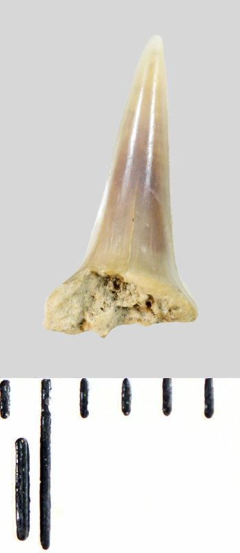 Зуб (фрагмент). Акула. Lamniformes gen. et sp. indet. Классификация: Хордовые Chordata, Позвоночные Vertebrata, Хрящевые рыбы Chondrichthyes, Пластиножаберные Elasmobranchii, Акулы Selachii, Ламнообразные Lamniformes