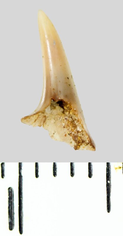 Зуб (фрагмент). Акула. Lamniformes gen. et sp. indet. Классификация: Хордовые Chordata, Позвоночные Vertebrata, Хрящевые рыбы Chondrichthyes, Пластиножаберные Elasmobranchii, Акулы Selachii, Ламнообразные Lamniformes