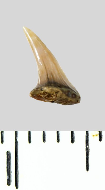 Зуб (фрагмент). Акула. Lamniformes gen. et sp. indet. Классификация: Хордовые Chordata, Позвоночные Vertebrata, Хрящевые рыбы Chondrichthyes, Пластиножаберные Elasmobranchii, Акулы Selachii, Ламнообразные Lamniformes