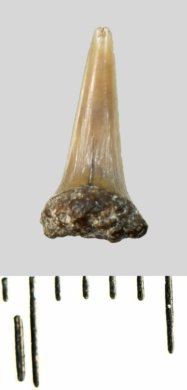 Зуб (фрагмент). Акула. Lamniformes gen. et sp. indet. Классификация: Хордовые Chordata, Позвоночные Vertebrata, Хрящевые рыбы Chondrichthyes, Пластиножаберные Elasmobranchii, Акулы Selachii, Ламнообразные Lamniformes