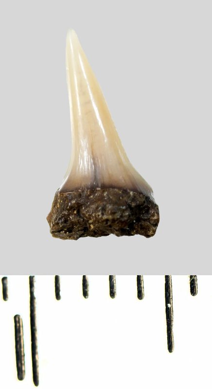 Зуб (фрагмент). Акула. Lamniformes gen. et sp. indet. Классификация: Хордовые Chordata, Позвоночные Vertebrata, Хрящевые рыбы Chondrichthyes, Пластиножаберные Elasmobranchii, Акулы Selachii, Ламнообразные Lamniformes