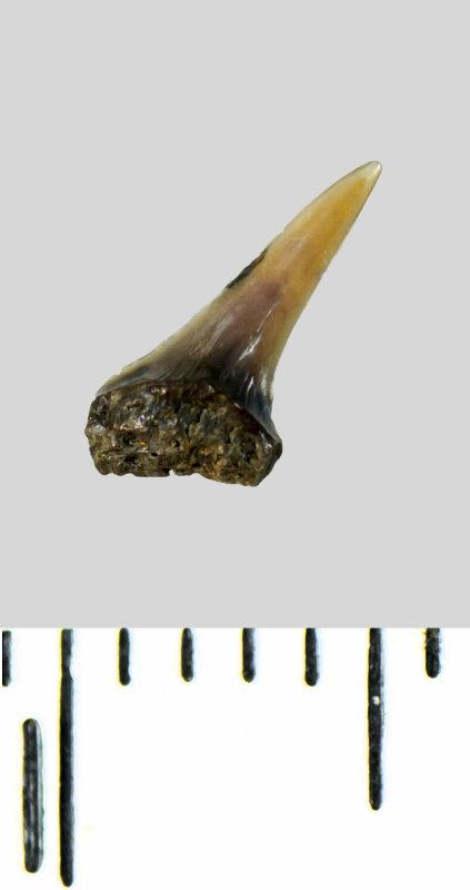 Зуб (фрагмент). Акула. Lamniformes gen. et sp. indet. Классификация: Хордовые Chordata, Позвоночные Vertebrata, Хрящевые рыбы Chondrichthyes, Пластиножаберные Elasmobranchii, Акулы Selachii, Ламнообразные Lamniformes