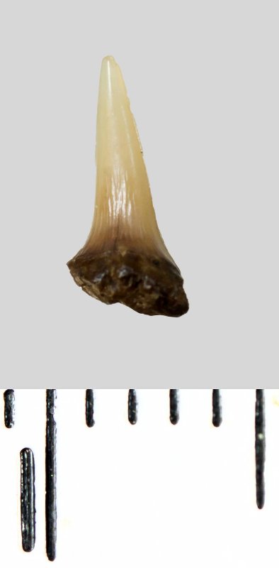 Зуб (фрагмент). Акула. Lamniformes gen. et sp. indet. Классификация: Хордовые Chordata, Позвоночные Vertebrata, Хрящевые рыбы Chondrichthyes, Пластиножаберные Elasmobranchii, Акулы Selachii, Ламнообразные Lamniformes