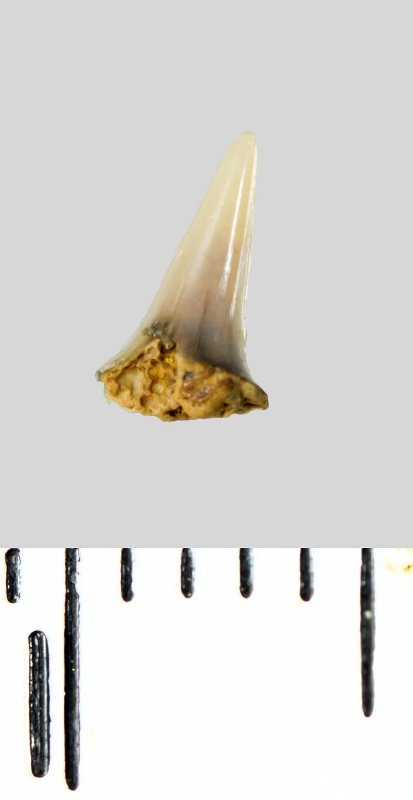 Зуб (фрагмент). Акула. Lamniformes gen. et sp. indet. Классификация: Хордовые Chordata, Позвоночные Vertebrata, Хрящевые рыбы Chondrichthyes, Пластиножаберные Elasmobranchii, Акулы Selachii, Ламнообразные Lamniformes