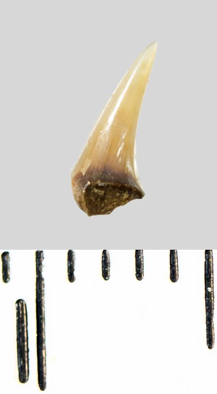 Зуб (фрагмент). Акула. Lamniformes gen. et sp. indet. Классификация: Хордовые Chordata, Позвоночные Vertebrata, Хрящевые рыбы Chondrichthyes, Пластиножаберные Elasmobranchii, Акулы Selachii, Ламнообразные Lamniformes
