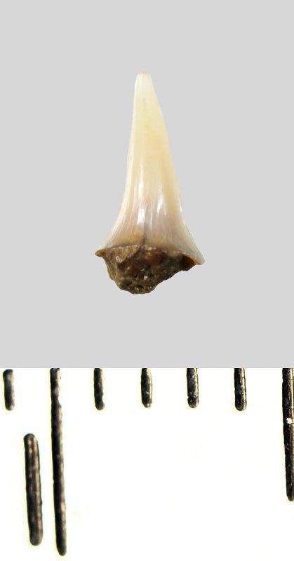 Зуб (фрагмент). Акула. Lamniformes gen. et sp. indet. Классификация: Хордовые Chordata, Позвоночные Vertebrata, Хрящевые рыбы Chondrichthyes, Пластиножаберные Elasmobranchii, Акулы Selachii, Ламнообразные Lamniformes