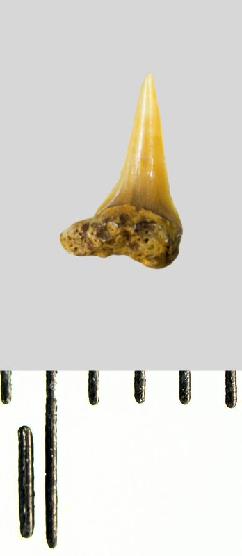 Зуб (фрагмент). Акула. Lamniformes gen. et sp. indet. Классификация: Хордовые Chordata, Позвоночные Vertebrata, Хрящевые рыбы Chondrichthyes, Пластиножаберные Elasmobranchii, Акулы Selachii, Ламнообразные Lamniformes