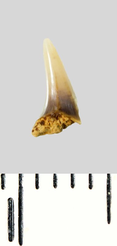 Зуб (фрагмент). Акула. Lamniformes gen. et sp. indet. Классификация: Хордовые Chordata, Позвоночные Vertebrata, Хрящевые рыбы Chondrichthyes, Пластиножаберные Elasmobranchii, Акулы Selachii, Ламнообразные Lamniformes