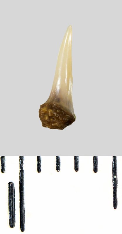 Зуб (фрагмент). Акула. Lamniformes gen. et sp. indet. Классификация: Хордовые Chordata, Позвоночные Vertebrata, Хрящевые рыбы Chondrichthyes, Пластиножаберные Elasmobranchii, Акулы Selachii, Ламнообразные Lamniformes