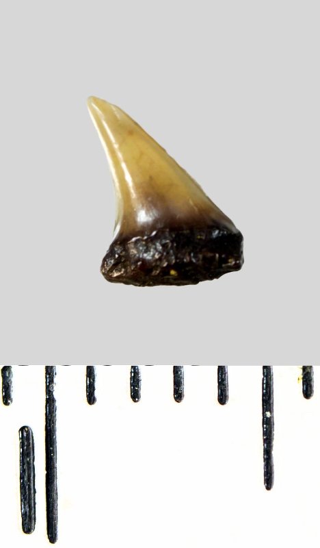 Зуб (фрагмент). Акула. Lamniformes gen. et sp. indet. Классификация: Хордовые Chordata, Позвоночные Vertebrata, Хрящевые рыбы Chondrichthyes, Пластиножаберные Elasmobranchii, Акулы Selachii, Ламнообразные Lamniformes