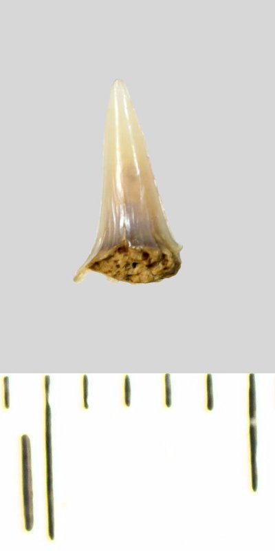 Зуб (фрагмент). Акула. Lamniformes gen. et sp. indet. Классификация: Хордовые Chordata, Позвоночные Vertebrata, Хрящевые рыбы Chondrichthyes, Пластиножаберные Elasmobranchii, Акулы Selachii, Ламнообразные Lamniformes