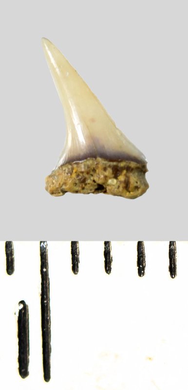 Зуб (фрагмент). Акула. Lamniformes gen. et sp. indet. Классификация: Хордовые Chordata, Позвоночные Vertebrata, Хрящевые рыбы Chondrichthyes, Пластиножаберные Elasmobranchii, Акулы Selachii, Ламнообразные Lamniformes