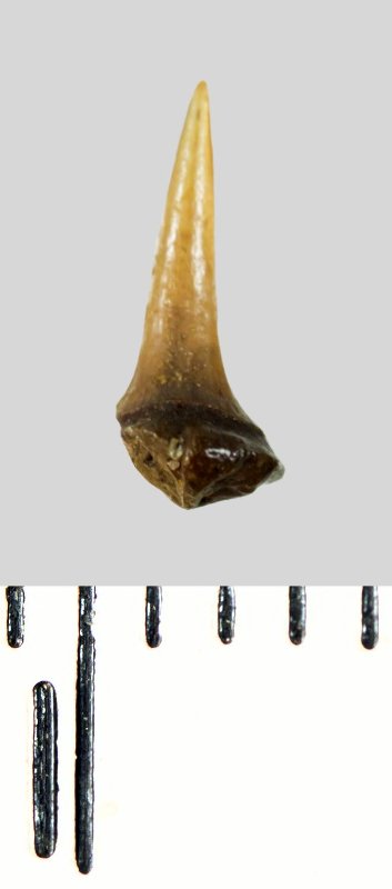 Зуб (фрагмент). Акула. Lamniformes gen. et sp. indet. Классификация: Хордовые Chordata, Позвоночные Vertebrata, Хрящевые рыбы Chondrichthyes, Пластиножаберные Elasmobranchii, Акулы Selachii, Ламнообразные Lamniformes