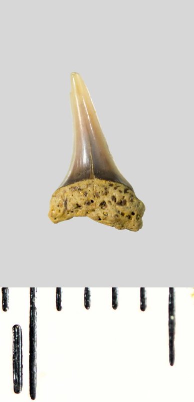 Зуб (фрагмент). Акула. Lamniformes gen. et sp. indet. Классификация: Хордовые Chordata, Позвоночные Vertebrata, Хрящевые рыбы Chondrichthyes, Пластиножаберные Elasmobranchii, Акулы Selachii, Ламнообразные Lamniformes