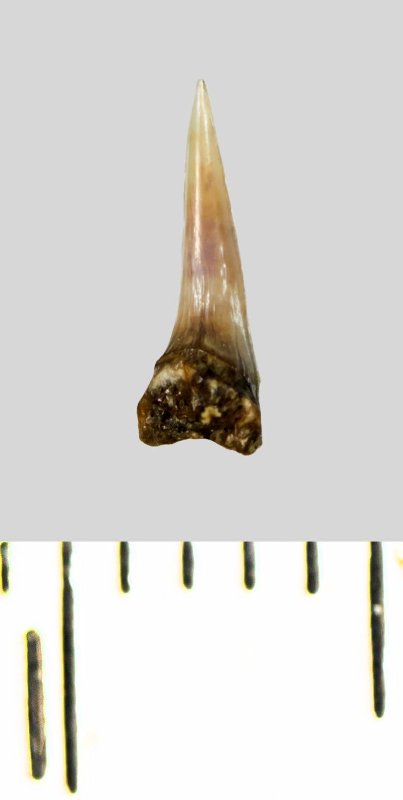 Зуб (фрагмент). Акула. Lamniformes gen. et sp. indet. Классификация: Хордовые Chordata, Позвоночные Vertebrata, Хрящевые рыбы Chondrichthyes, Пластиножаберные Elasmobranchii, Акулы Selachii, Ламнообразные Lamniformes