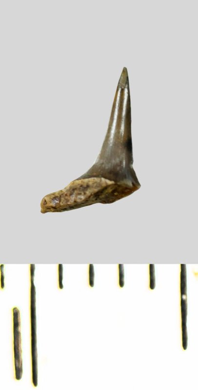 Зуб (фрагмент). Акула. Lamniformes gen. et sp. indet. Классификация: Хордовые Chordata, Позвоночные Vertebrata, Хрящевые рыбы Chondrichthyes, Пластиножаберные Elasmobranchii, Акулы Selachii, Ламнообразные Lamniformes